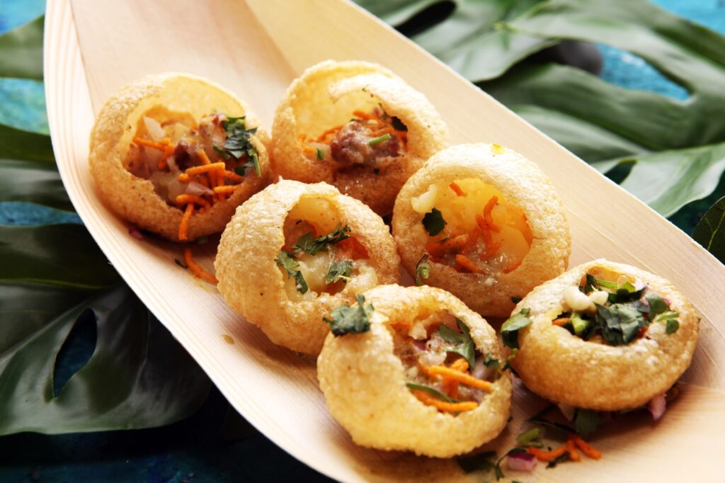 Pani Puri or Golgappa is a popular street food in India. Pani Puri consists of a round or ball-shaped, hollow puri (a deep-fried crispy crepe), filled with a mixture of a type of soup with different flavors (known as Teekha Pani), sweet chutney, potatoes, and onions.