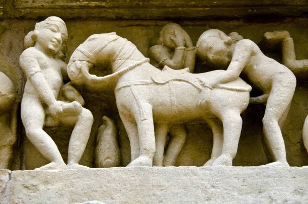 Khajuraho is a small town in Madhya Pradesh in central India and has a population of about 40,000 inhabitants. It is known for its Hindu and Jain temples, which were declared a World Heritage Site by UNESCO in 1986. Several of these temples in Khajuraho contain erotic sculptures that were built between 950 and 1050 by the Chandela dynasty. Apart from erotic figures, we can find representations of royalty, armies, wrestling, war, dance, spiritual teachings, gods, plants or animals.