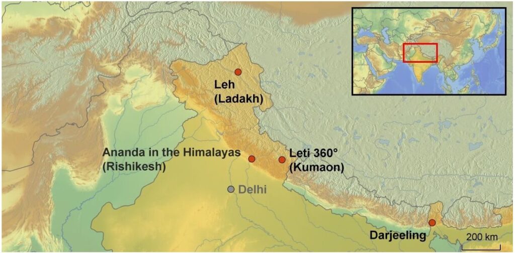 The Himalayan regions of India are not only wonderful for being active on hikes, but also for relaxation at its finest. Complete peace and quiet in front of a magnificent backdrop can be found in the 360° Leti resort, which is secluded at a height of over 2,400 meters in the middle of the untouched mountains of Kumaon. From the only four pavilions, guests can enjoy a wonderful panorama even in bed thanks to the large windows. Meditation, yoga, walks and evenings by the campfire – always surrounded by majestic peaks – make the stress of everyday life seem a long way away.